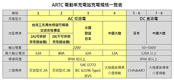 此座台灣第一的電動車充電站已於七月上旬動土,不僅是台灣電動車發展的重要里程碑,更具有全球創新性的意義,因為現今國外充電站之建置,多依各自地區標準僅提供單一充電介面規格;基於國內產業之主力市場以全球外銷導向,為充分提供國內業者完整的產品驗證環境,所以廣納國際各式快、慢速充電規格等一應俱全,不管是台灣工業局先導運行規範、日本CHADEMO、大陸GB、美國SAE、歐規IEC TYPE I等都可來電;隨著美國、歐洲充電標準之持續發展,未來也會於此充電站示範平台陸續規劃、建置。