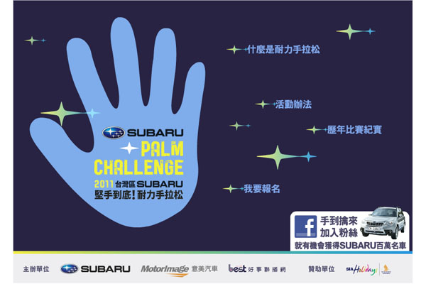 台灣意美汽車公司自2009年開始在台舉辦Subaru「堅手到底」耐力手拉松比賽,每年皆吸引近百位民眾爭相參與。今年第三屆賽事即將展開,在歷經漫長的12小時挑戰與考驗後,堅持到最後的10位參賽者,將贏得新加坡來回機票及住宿招待,並代表台灣參與亞洲區總決賽,與亞洲十個國家爭奪Subaru百萬名車!
