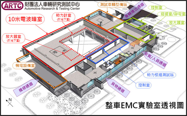 ARTC黃隆洲總經理表示,新建整車EMC實驗室的各項設備中,以大型車EMC電波暗室最受矚目,這將是一座可容納大型巴士進入,並可在測試轉台上進行360°旋轉,及從事EMS(Electromagnetic Susceptibility,電磁耐受)、EMI(Electromagnetic Interference,電磁干擾)、ESD(Electrostatic Discharge,靜電放電)與動力系統EMI/EMS等測試的巨大工程。為了要跟全世界齊步,甚至設法超越,所以評估時即benchmark全世界八大實驗室取其精華,也特別針對歐、美、日少有或缺乏的設備加以建置,讓台灣一步到位,滿足未來產業對電動車及車電關鍵零組件的研發測試所需。
