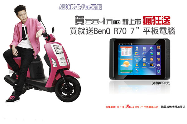 即日起只要購買Co-in 110車款,便同時送出BenQ新推出的七吋平版電腦R70,數量有限,有興趣的消費者決定不容錯過!