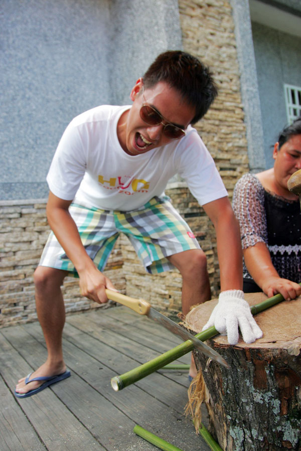 第一天的活動主軸是體驗在地文化,「96五超人」親手製作竹筒飯,要從鋸竹筒的基本功做起。