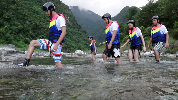 「96五超人」在花蓮體驗原住民傳統文化活動—古母健水,沁涼的溪水令大家暑意全消。