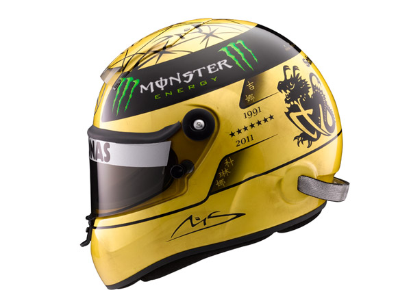 這頂20週年紀念帽除了外觀是以21克拉鍍金覆蓋搭配相當具有東方色彩的圖裝之外,帽體本身依然維持了Schuberth擅長的碳纖維材質,而帽帶的部分則是以Kevlar負荷材質為基礎,經過特殊配方的浸泡能夠提高防火係數,並且在內裡的部分也是以高防火系數的Nomex®.材質為主,皆通過H.A.N.S.與FIA兩個機構的測試認證。