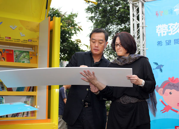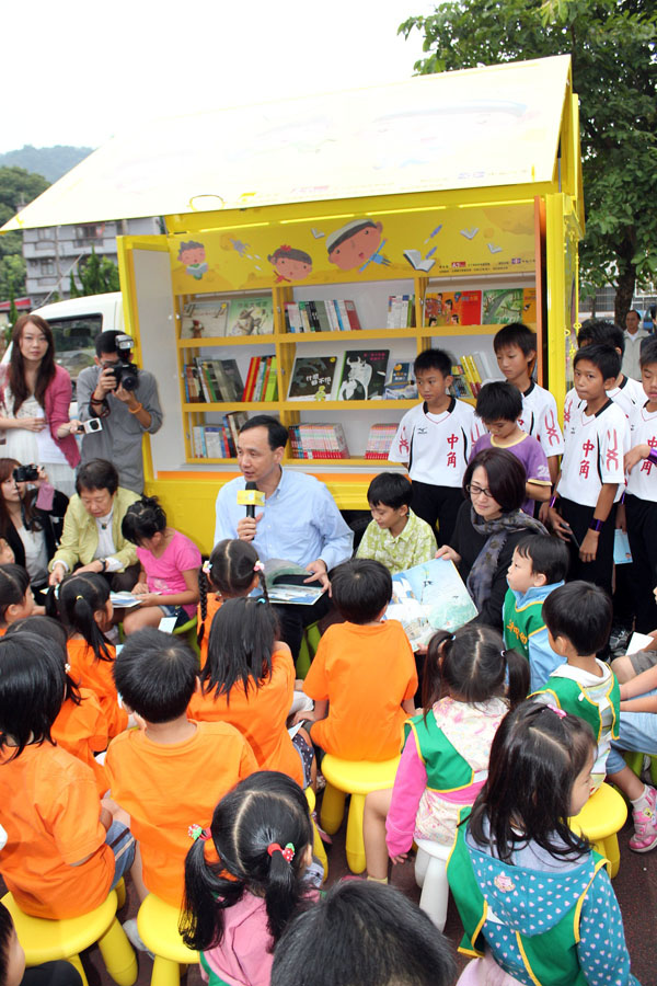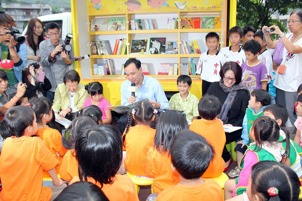 朱立倫市長與陳莉蓮夫人為小朋友導讀愛作夢的小男孩。