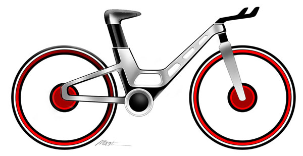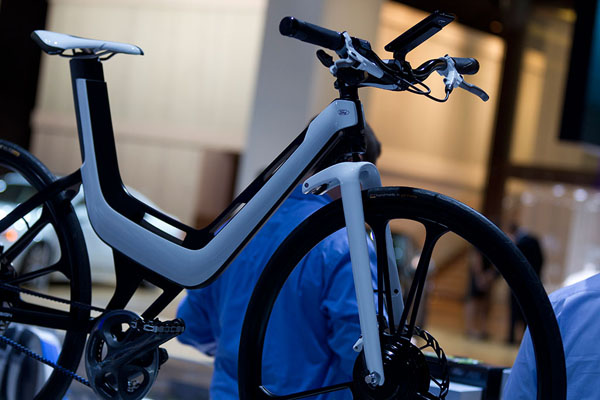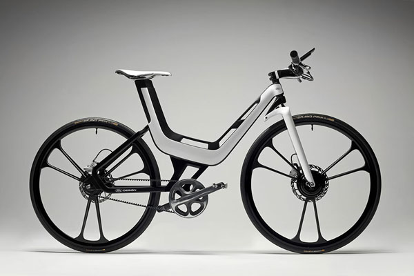 全新亮相的E-Bike Concept是由Ford設計執行總監Martin Smith領銜設計而來,將Ford於汽車上的全新設計語彙融入其中,並且以中性角度這款無性別差異、人人可使用的未來交通工具,採不規則的梯型車架設計,並且使用鋁合金與碳纖維材質,創造出高強度、輕量化結構,全車僅2.5kg,黑色地鋁合金輪圈則在經過風洞測試後以六輻V字造型,後軸部分仍採傳統的自行車腳踏驅動模式,採用,龍頭把手採台灣捷安特出品、110mm之SLR Carbon碳纖維品,變速系統則是Shimano Alfine 11速內變速系統,並且透過碳纖維鏈條負責驅動。
