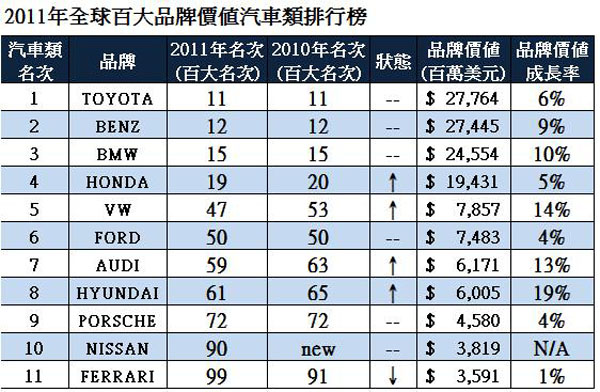 根據調查統計,2011年最具價值的全球前100大品牌當中,汽車產業便佔了其中的11席,依序為Toyota(第11名),M-Benz(第12名)、BMW(第15名)、Honda(第19名)、VW(第47名)、Ford(第50名)、Audi(第59名)、Hyundai(第61名)、Porsche(第72名)、Nissan(第90名)以及Ferrari(第99名)。汽車相關產業在全球前100大最具價值的品牌當中,可以拿下11個席次,也顯現出汽車產業在歷經超過百年的歷史以及與人類生活息息相關,其重要性可是絲毫不輸於生活飲食、甚至是3C電子的領域。