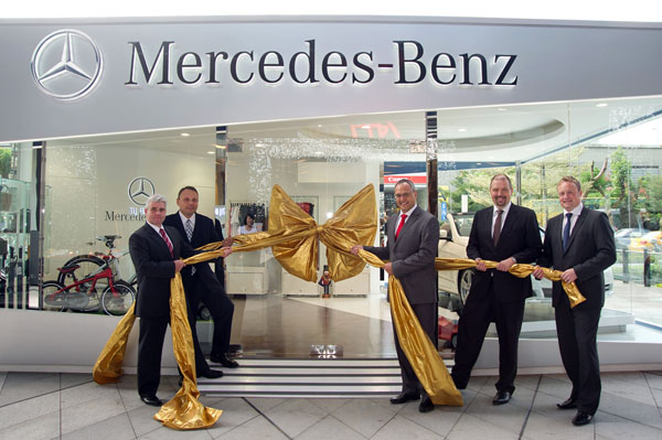 台灣賓士總裁康柏瀚(右三)、營運副總裁波利斯(右二)、售後服務副總裁史安德(左一)、售後服務行銷暨物流營運協理羅期瑞(左二)及財務行政副總裁暨財務長艾思文(右一)一同為Mercedes-Benz首間「璀璨星時尚」精品概念店進行開幕儀式。