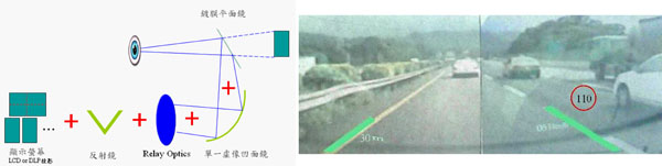 左圖為反射式顯示光機架構,右圖則為實際道路顯示效果。