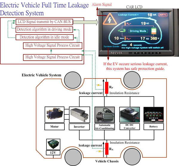 為達到電氣安全的防護目標,電動車動力驅動系統等高電壓裝置必須是獨立的電氣迴路,不會與車上其他低電壓的系統如燈光、音響等交互影響,降低人員觸電機會;但車輛經過使用後,可能因為潮濕、振動、元件老化、破損等因素,降低絕緣能力,增加高電壓系統漏電機會。本發明透過絕緣電阻量測系統模組,可在電動車輛靜止及行駛中提供全時偵測,並透過車載螢幕引導駕駛者進行狀況處理。例如當偵測到輕微漏電時,會警示駕駛者應儘速進廠維修,但如偵測到嚴重漏電,則會啟用安全保護策略,提醒駕駛者應立即停妥車輛,之後系統會自動啟動防護機制關閉高壓迴路以確保人車安全,讓駕乘智慧電動車毋須時時擔心漏電危險。