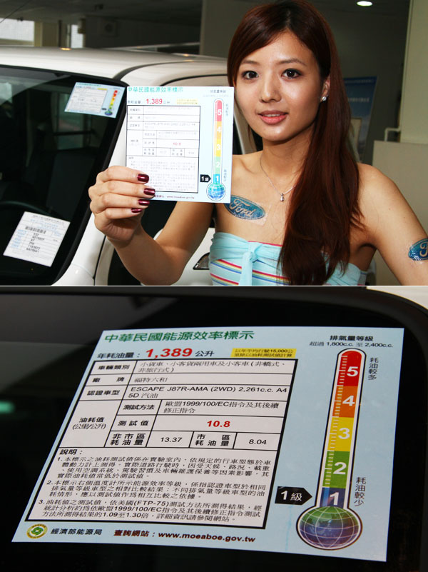 從2010年7月1日起,經濟部能源局頒訂之汽車節能效率標示,都可以在每輛展示新車上看見「中華民國能源效率標示」與「能源效率等級」標示,作為選購參考。