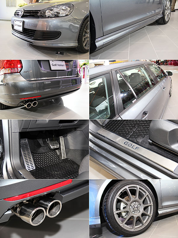 Golf Variant Sporty套件展示車型加裝前後下擾流板、尾翼、側裙、後廂鍍鉻飾板、不鏽鋼車門護碇飾板、碳纖維飾板、18吋鋁圈,並改上ABT短彈簧等套件。