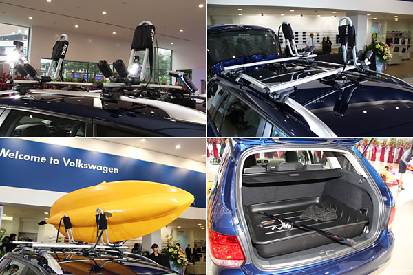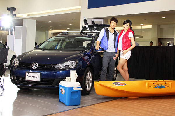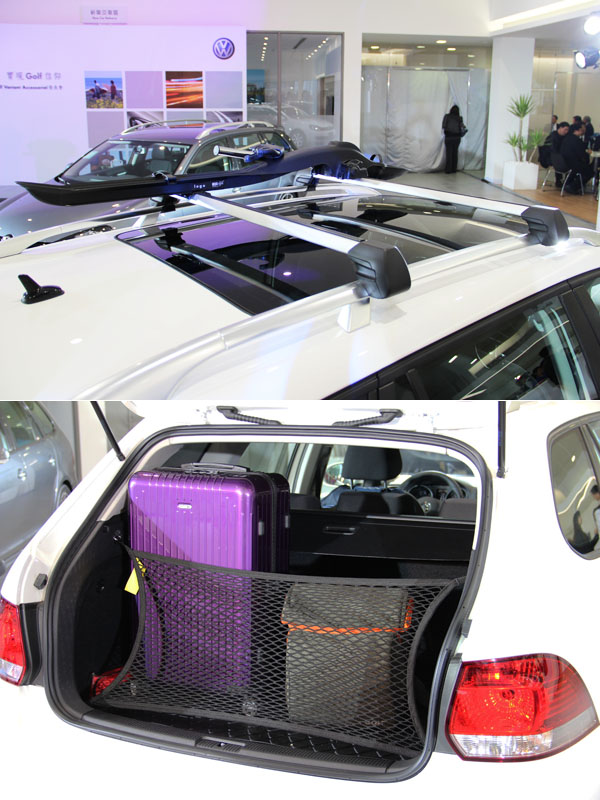 Golf Variant Outdoor展示車型加裝了可載運獨木舟的車頂架、行李廂隔網、DVD多媒體影音組、霧燈組等配件。