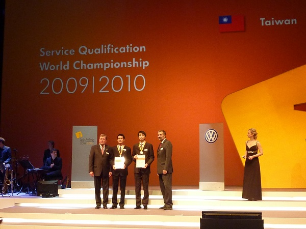 2009/2010年度SQWC服務品質競賽前後歷時將近一年;今年5月,計有來自全球60個國家的參賽者在德國狼堡VW總部競相角逐總決賽冠軍寶座。台灣技師游順帆在亞太區18個國家的強烈競爭中脫穎而出,贏回SQWC維修大師亞太區首獎;總代理標達汽車長期投注於人員培訓與技術養成的成效斐然,屢屢獲獎頗受原廠高度肯定。(由左至右)Volkswagen德國原廠售服授證總裁Mr. Walka,太古文心廠服務顧問陳永振,榮陞經國廠工程師游順帆,Volkswagen亞太總部行銷總裁 Mr. Preine