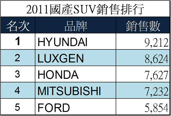 另一個好消息是深受國人所喜愛的國產SUV車款,Hyundai在2011年也拿下了國產SUV的品牌銷售冠軍。品牌SUV以全年銷售9,212輛的成績,擊敗了LUXGEN(8,624輛)、HONDA(7,627輛)及MITSUBISHI(7,232輛)、FORD(5,854輛)等品牌,奪下國產SUV品牌的年度銷售冠軍,顯示Hyundai即為當前國產SUV的最佳首選。