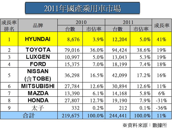 現代汽車去年(2011年)可算得上是一匹車市的黑馬,在新的一年初傳出了二個好消息。在整體國產乘用車市場而言,去年(2011年)總台數244,441輛,相較前年(2010年)總台數219,675輛,成長了11%。在各家車商有增有減的情況下,全球第四大車廠Hyundai在台灣的國產乘用車市場以去年(2011年)總台數12,204輛,相較前年(2010年)總台數8,676輛,成長了41%,為各家國產車品牌之冠,年成長率排名第一名。
