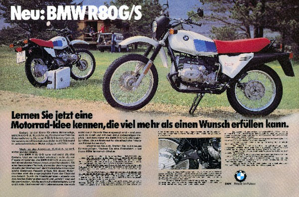 800c.c.排氣量的BMW R 80 G/S不僅是當時排氣量最大的越野車,最高168km/h的極速也讓競爭對手望塵莫及,底部離地218mm的高度與200mm/170mm的前/後避震器行程讓越野車的特性展露無遺,但是媒體的注目焦點都集中在〝Monolever〞後單搖臂,這項創新設計較傳統避震器減輕了2公斤重量,而抗扭力卻增加了30%,這樣的特性可以大幅減少橫向作用力對避震器的影響,167公斤的乾燥重量造就了最輕的800c.c.摩托車,電子點火系統與前輪碟煞的配備更是當時史無前例的設計。但是長途越野車的概念在當時是否能被接受一直是個疑問,而這些疑問在G/S絕佳的操控性與媒體熱烈的回應下一掃而空。新車的出現不僅成功震撼了媒體,更讓當時的摩托車雜誌視G/S為BMW最傑出的兩輪作品。總結所有G/S的試駕報告,BMW證明了他們以大膽創新的概念,完美打造出嶄新的全地形車。