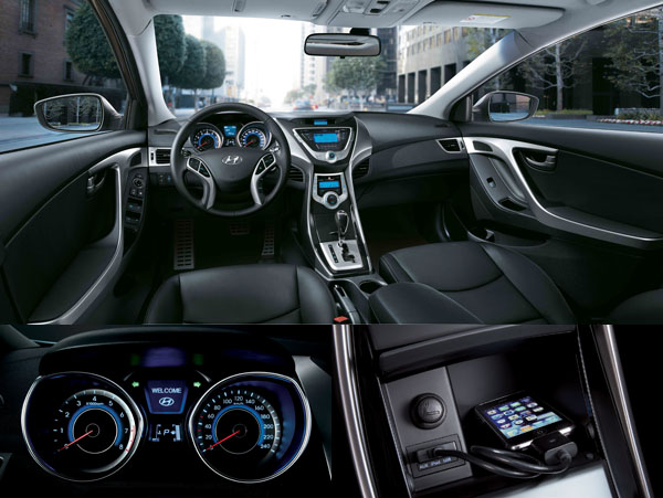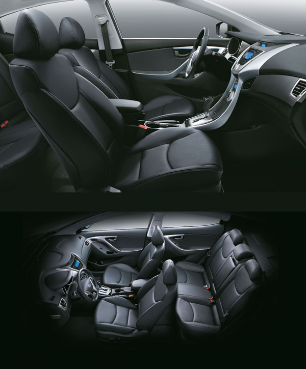 Hyundai的流體雕塑設計,不僅止於車體外觀,連內裝設計也隱含著流體雕塑的設計理念。車艙所印入眼簾的是科技與前衛,新世代內裝設計真是不遑多讓;Y字型線條中控台設計,輔以霧銀塗裝,更添動感、豪華的印象。採用與性能跑車相同的雙筒式設計及藍光儀錶,充份提升駕駛辨識度,操作按鍵改置於方向盤,提升駕駛安全。All New Elantra的多功能方向盤,以X-shape造型為基本造型,整合音響/定速/旅程電腦等多功能按鍵,大幅提升使用便利性以及安全性。