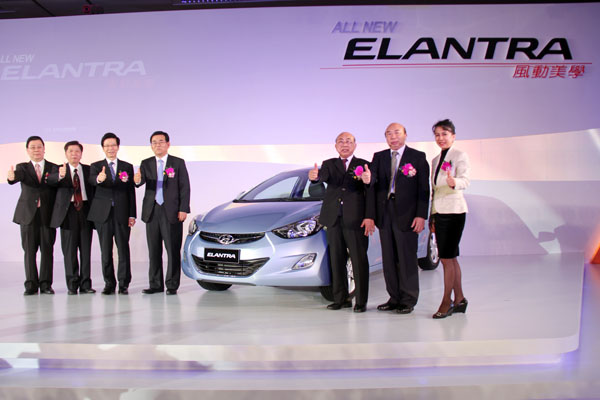 Hyundai All New Elantra發表會與會貴賓合照一由右至左分別為:三陽工業 黃悠美副董事長、慶豐寰宇 黃世雄副董事長、三陽工業 黃世惠董事長、現代汽車中國事業本部 崔成起副社長、大韓民國駐台北韓國代表處 丁相基大使、三陽工業 江世煌總經理、南陽實業 賴瑞龍總經理。