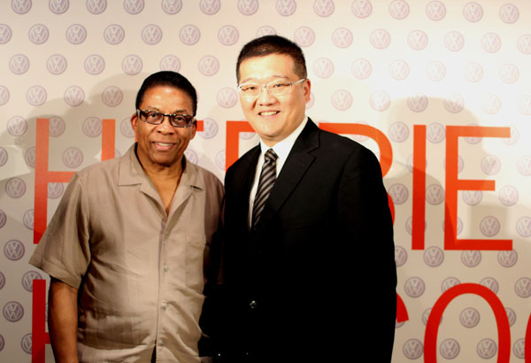 福斯商旅車企劃副總經理(右)柳家瑜與美國爵士天王賀比‧漢考克(HerbieHancock)一同出席今日爵士天王抵台記者會。