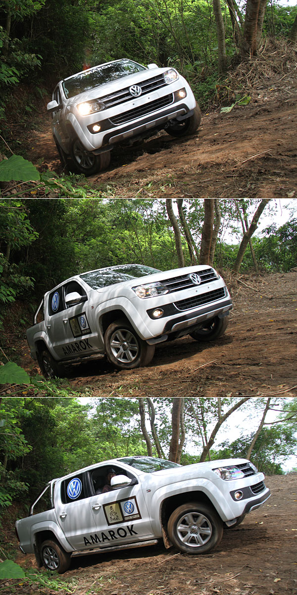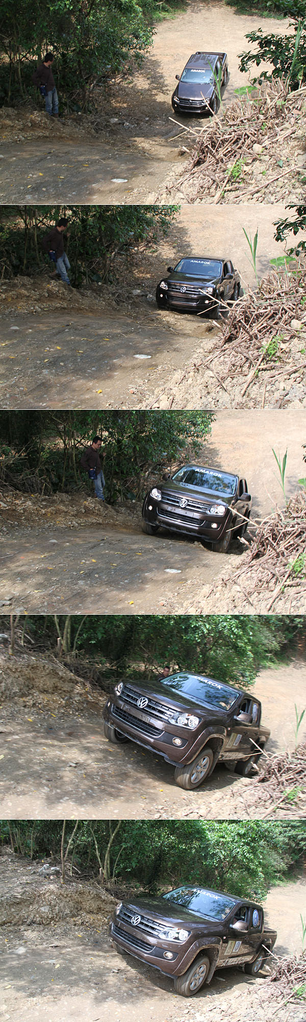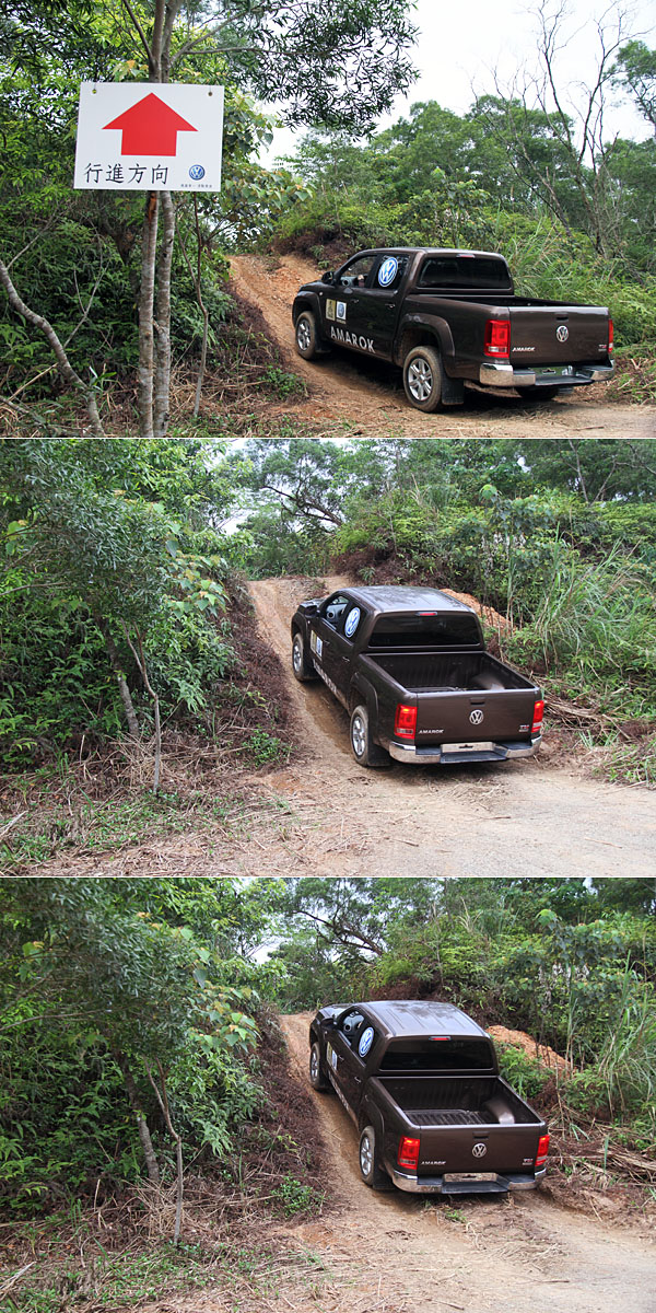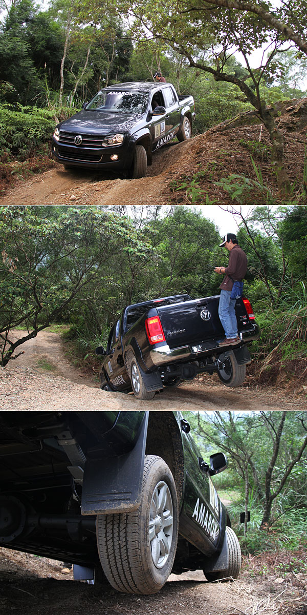 林道中的奔馳,Amarok皆四平八穩的完成。最後的急升左彎,由於連日來車輛不斷的爬坡、車胎深掘泥土後,路況與抓地力實在不佳;但教練依舊一派輕鬆,再次切換至4×4 LOW模式,首次啟動後輪差速器,保持二檔,煞車一放油門一補,在左彎前保持衝力後,經過左彎時雖然前輪不斷的往右下方滑動,但後輪差速器鎖定功能適時的給予後輪抓地力與推力,掙扎些許後,前輪著接觸平地,後輪隨即跟上,自認為最難的一關,就這麼搞定!