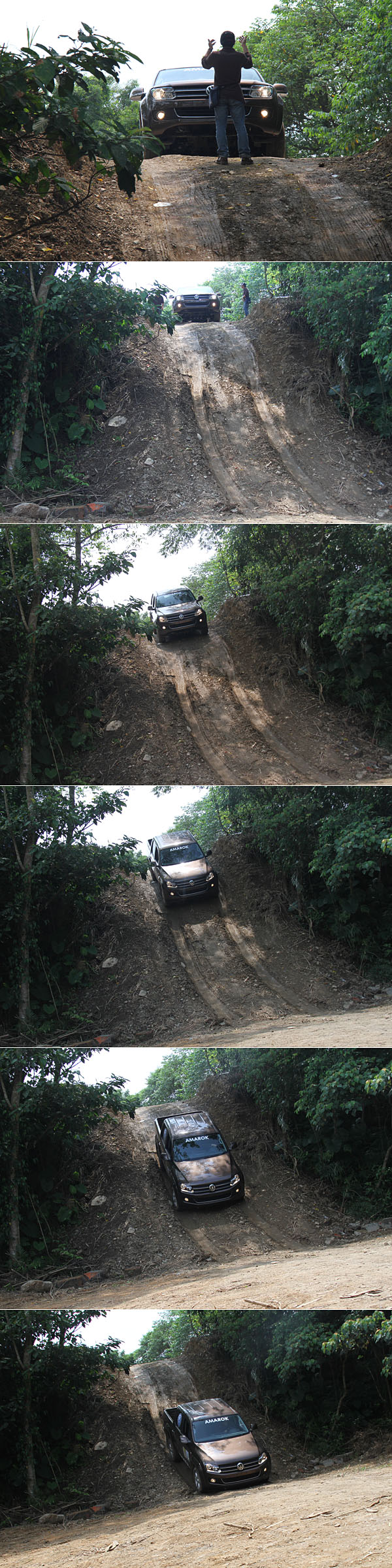 好了,複雜的功能解說完畢,我相信讀者早已我與迫不及待的想要攻克第二個陡坡了吧?別忘了,此時還是由教練駕駛,為了展示所有越野功能,教練面對第二個坡度更陡的上坡,採取多次攻克方式。簡單而言,就是利用不同的模式,來挑戰此陡坡,讓坐在副駕駛座的我,能了解到在不同模式下,Amarok的越野功力,會有何等差異。