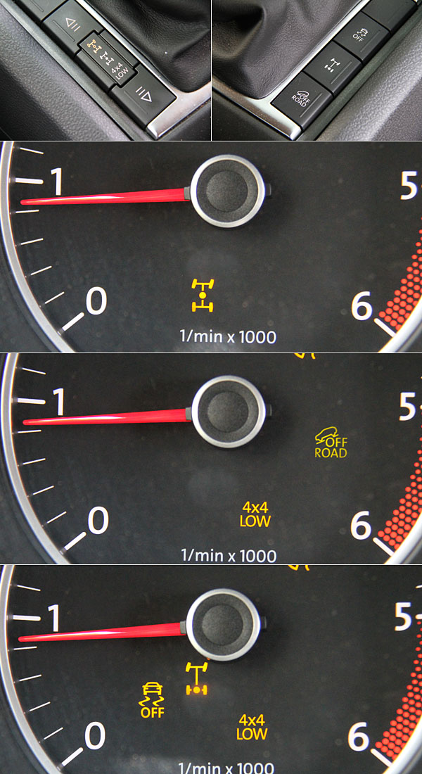 列於排檔座兩側的多組按鍵,乃是可控制兩輪驅動、四輪驅動、加力檔、電子行車輔助系統、後輪差速器鎖定與越野模式切換等功能;其中四輪驅動、加力檔到後輪差速器等功能切換,皆會於轉速表內以燈號指示,切換時燈號會閃爍,需等到閃爍完畢時方代表系統切換正常。而二輪驅動模式切換到四輪驅動模式可於任何時速中切換,但相當不建議於一般路面行駛時切換到四輪驅動模式。