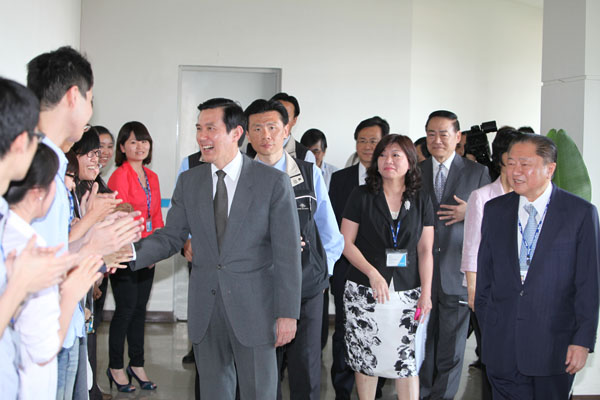馬英九總統抵達台灣環保企業台達電子台南廠,受到員工熱烈歡迎。