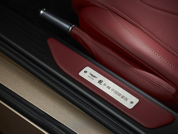 限量88台的了Dragon 88 special editions特仕車,將不會限定以單一車型上,而是以DBS Volante、Virage Coupe、V8 Vantage S Coupe三款車型為基礎,買家可依喜好選擇車型後,採用Dragon 88特仕版本;而Dragon 88 special editions特仕車將提供三種於華人世界中象徵尊貴、喜氣與大器的金、紅、黑三種車色,並且將且將引擎蓋上的廠徽改為24k鍍金打造,車室中同樣融入上述三種顏色元素,在黑色飾板上有著金色中國風彩繪,頭枕上也繡有金龍圖騰,同時於門檻上嵌上印有〝龍年 88 中國限量版〞字樣之銘牌以彰顯身分。