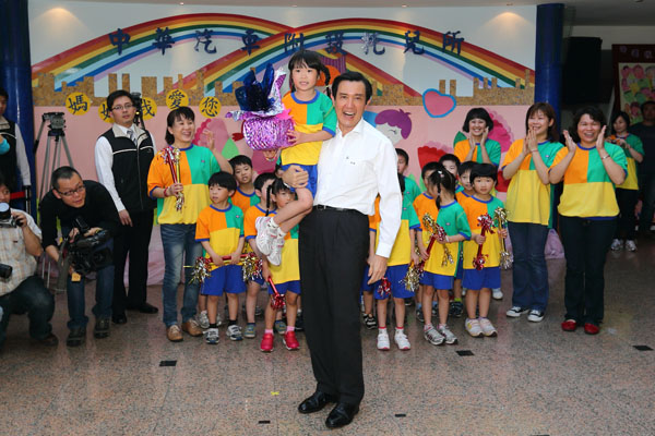 總統參訪中華汽車托兒所送來小禮物 開心與小朋友合影。