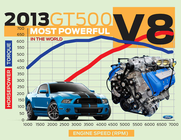 Shelby GT500最大馬力在經過SEA認證後,Ford便宣稱該具引擎為當今最強的量產V8引擎,比起Mercedes-Benz S 63 AMG還多了99hp,也比Chevrolet Corvette的638hp/604 lb-ft更加強悍,最直接的對手Chevrolet Camaro ZL1也只有580hp/556lb-ft的動力輸出。不過這似乎未將數量稀少的Koenigsegg Agera車系給算進去,因為基本版的Agera搭載之5.0L V8雙渦輪增壓引擎擁有960hp驚人動力。