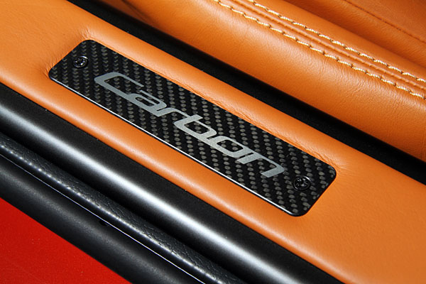 座艙內的設計延續碳纖維與黑色主軸,中控台上部導入了碳纖維質材,而車內所有Bang & Olufsen的揚聲器外飾蓋,以黑色設計取代了原有的霧面銀色;方向盤改為了真皮與Alcantara類麂皮材質的混合,迎賓飾板則寫上了Carbon為自身特有的身分作註記;不過說內裝最特別之處,則是要提及最不容易被注意的車頂篷,以特殊且復古的條紋縫線方式,取代了慣用的Alcantara材質的大面積鋪陳。