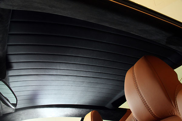 車頂篷以特殊且復古的條紋縫線方式,取代了慣用的Alcantara材質的大面積鋪陳。