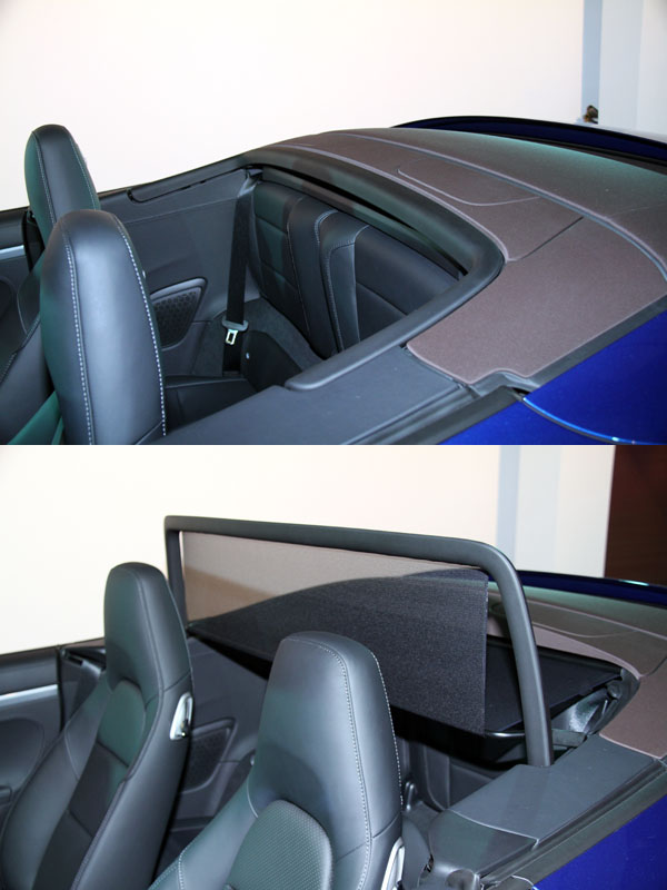 按下按鈕後,此托架即可在兩秒鐘之內展開一張防護網,並由前座扶手後方的第二個可移動式轉向托架依直角方向拉緊。迴風防護網可在高達 120km/h的車速下展開。其作用與前代車型相同,可將氣流擾動降至極低的程度並將敞篷駕駛時的風切聲減至最小。展開的迴風防護網可在軟篷車頂關閉時自動收起。