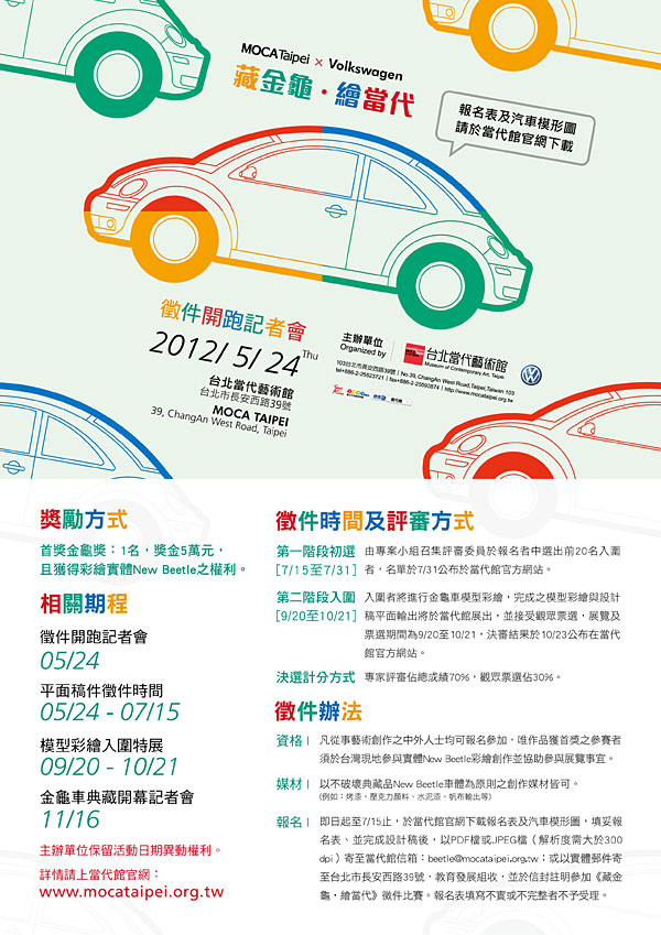 這次「藏金龜 繪當代」的彩繪創作徵選活動自5月24日至7月15日展開徵件,凡從事藝術創作之中外人士皆可參加;並以不破壞New Beetle車體原則之所有創作媒材都能選擇使用。初期將先挑選出20名入圍者後,進行模型彩繪;而第二階段的評選除邀集專業人士之外,並將開放民眾票選,於10月23日公佈首選。其作品將進行實體彩繪,而正式典藏至台北當代藝術館時間將訂於2012年的11月16日。有意參與New Beetle彩繪創作的藝術家可至當代藝術館的官網下載報名表及金龜車模型圖。
