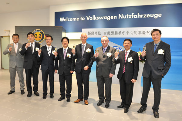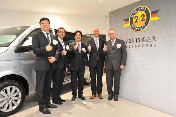 福斯商旅今與德國原廠一同宣佈推出4年15公里延長保固方案,(從左至右) 太古汽車營運長謝才敏、太古汽車總裁陳世傑、台南市長賴清德、福斯商旅亞洲區銷售經理Mr. Dietmar Pohl、福斯商旅亞洲區售後服務經理Mr. Hubert Korzuscheckl等人。