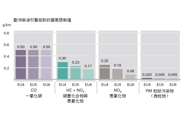 此外,VW所進口的柴油引擎皆備渦輪增壓器,可提供省油及引擎動力性能提升,安裝在排氣管上的微粒過濾系統、氧化觸媒與廢氣再循環系統,不論是二氧化碳、一氧化碳、碳氫化合物的濃度都控制的相當嚴苛。〈刊頭圖為VW Passat BlueMotion引擎採用 SCR系統之後,已符合目前最嚴格的廢氣排放標準。已達到歐洲將於 2014 年實施的 EU6 廢氣排放標準,此已高於現今台灣所制定之五期標準。〉