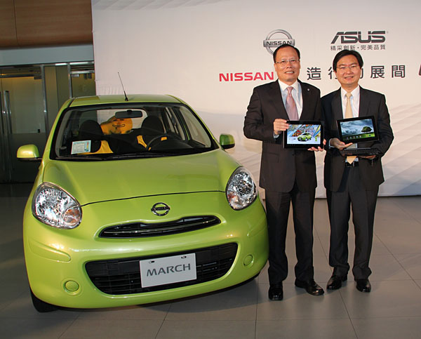 裕隆日產汽車蔡文榮總經理(左)與華碩聯合科技林福能總經理(右)共同出席Nissan打造行動展間記者會。