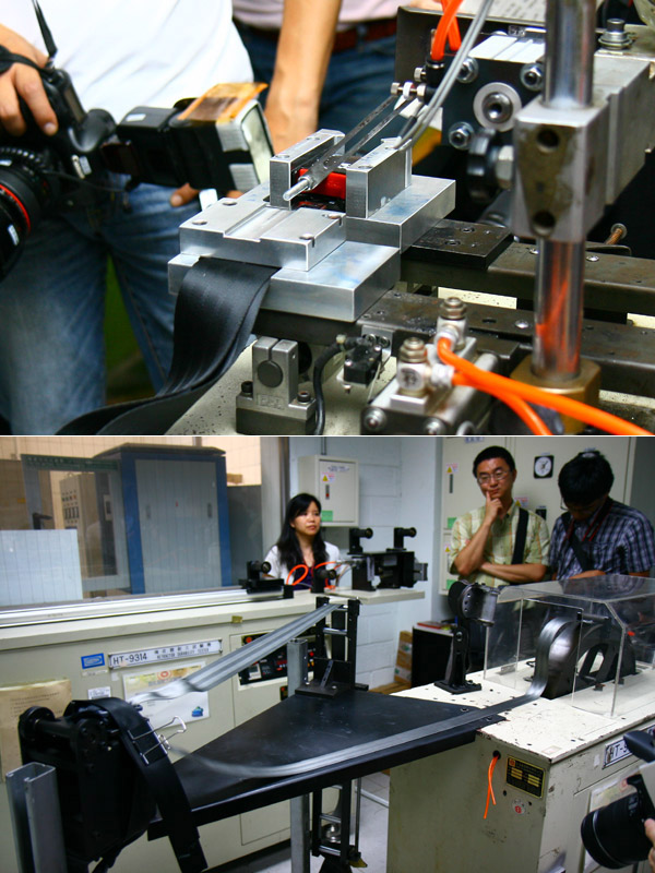 來到實驗室,首先看到的是安全帶帶扣組耐用測試;全自動化的機械模組啟動後,就不斷地將安全帶扣上、開啟,之後便重複動作,測試基本回數則高達數千次。測試期間,帶扣組不得有鬆脫、毀損之類的情形,這樣才有最基本的資格能應用、並予以販售。接著一旁則是安全帶織帶耐磨測試機,這邊模擬一般車用的三點式安全帶形式,同樣反覆的鬆綁、與拉緊動作,測試力道是用「扯」的!測試次數也同樣地千次起跳。測試期間,織帶不得有起毛球、或斷裂等情形發生,才能獲得認可。