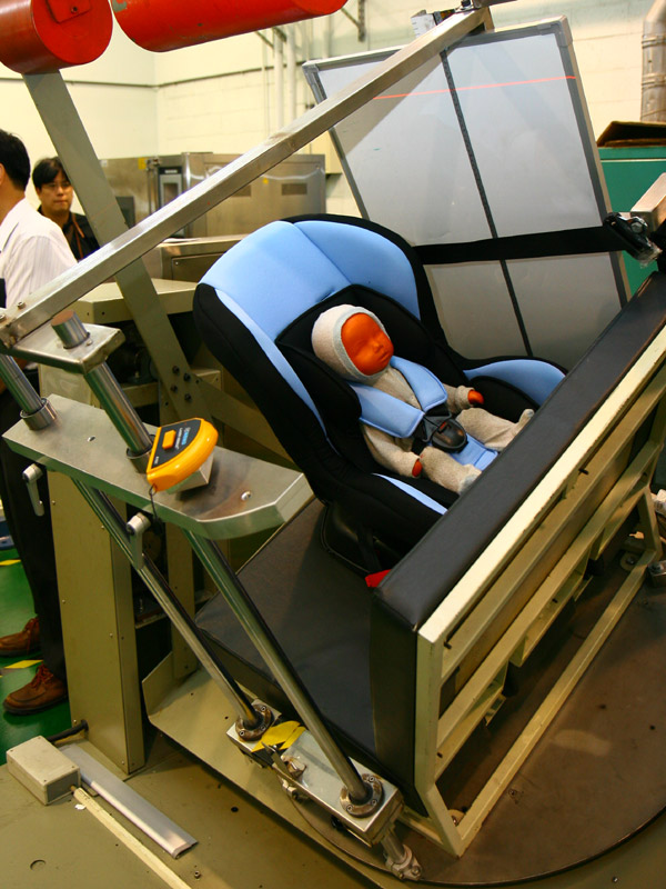 再來就是兒童安全裝置實驗室了,一開始看到的,就是最新納入測試規章的「ISO-FIX」耐用測試;ISO-FIX明確地說,就是兒童安全座椅後方底部左右凸出各一的扣環裝置,藉由與車輛座椅設計的扣套卡榫相結合,達到固定兒童安全座椅的功效。而依照各廠牌安全座椅不同,ARTC建議消費者,在購入兒童安全座椅後還是必須詳閱其說明書,並按照指示正確地安裝。ISO-FIX雖然是一種固定形式的裝置,但各廠家的安全座椅,還是會有設計上的差異,為確保兒童安全,多用點心、也更能保障孩童安全。