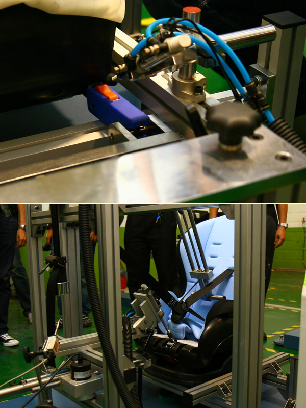 重頭戲就是準備了數十分鐘、就為那短短0.1、0.2秒的動態撞擊測試;這次的示範,是以一具幼童人偶為主,模擬不正確以一般子母背帶將孩童固定在後座、並於時速約48km/h的狀態下遭受撞擊的後果。實際的測試真的是震撼無比,雖然時速48km/h乍聽之下不快,但撞擊的那一瞬間真的就幾毫秒而已,只聽到「咻~啪!」地就結束了,結果就是背帶整個扯掉、人偶不成人形地倒在一旁…