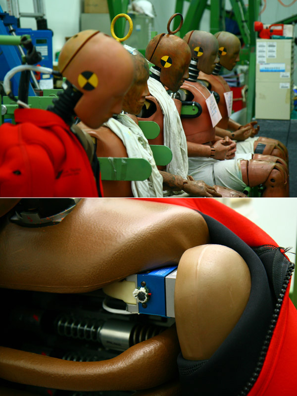 上述測試皆屬「靜態測試」範疇,在即將進入動態測試觀摩前,先看看代替人類上場受測的模擬人偶。ARTC置放這些人偶的存放室,可是控溫、又控制濕度的,這些人偶代替真人上場,有這樣的待遇也不過分吧?以模擬成人的人偶來說,一尊的造價就高達約150萬新台幣,如果再加上各部位的感應器,這一尊的造價更高達新台幣約300萬!使用此精密的人偶測試,也是為了盡可能趨近真人的受力程度,也才能有更精準的產品安全規範。