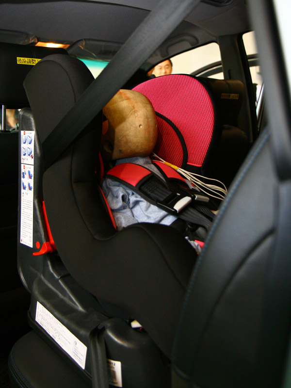 接著,ARTC在動態測試區準備了一輛安裝有兒童安全座椅的實車,讓所有媒體觀摩。這輛車的後座安裝有針對不同年齡、體重的孩童人偶,依照條件不同,使用的增高墊、與安全座椅安裝的方式也有所不同。同時,ARTC人員也示範了各種常見的安全帶錯誤使用,以實際操作,讓所有人了解安全帶最正確地使用法─兼顧肩部、胸部、臗部約束與支撐的調整。