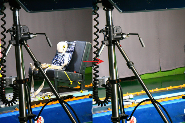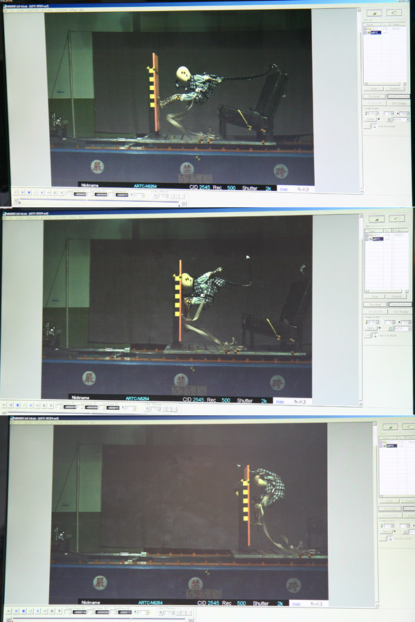 ↑ 藉由ARTC高速動態攝影機,可以明顯觀察到孩童人偶幾乎是在沒有位移的情況下被擋板砸個正著。