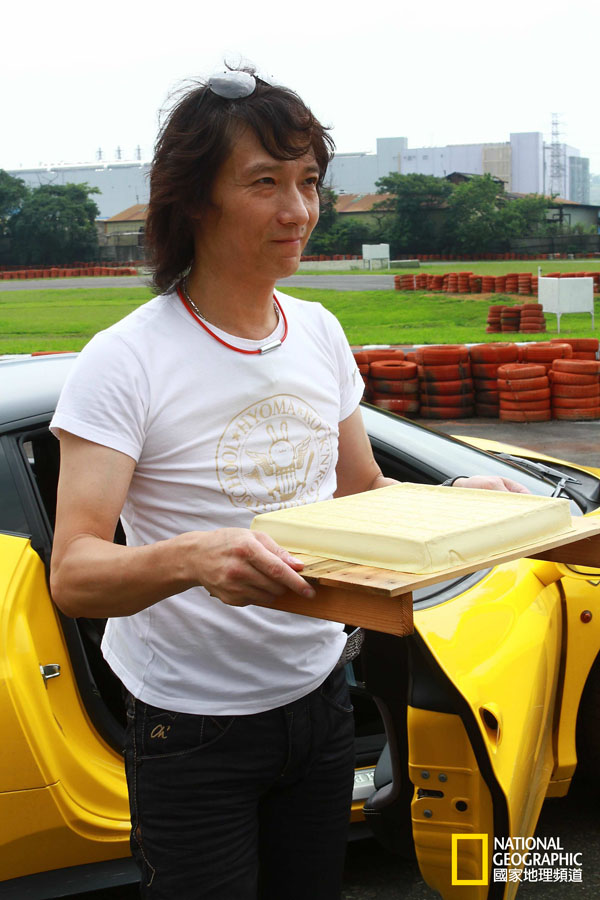 陳俊杉進一步談到,以前看到”頭文字D”這部漫畫,對此經典畫面,也有過很多憧憬,「起初我覺得這有可能嗎?」但,隨著實際的賽車,累積了許多的經驗,見解不同了。「現在,我知道是不可能了!」但是,他知道,看過這部漫畫的熱血男兒們, 每個人心中都有一個豆腐在動的畫面。但是,事實上,這畫面是否真實存在? 陳俊杉表示,豆腐在高速下,不碎是完全不可能的,如果還能完好如初,那就是「車速不夠快! 開得太慢!」,因此,陳俊杉在拍攝國家地理頻道的形象短片,他表示:「我要挑戰,以不同的速度,測試豆腐,試試看,在哪種速度下,他會碎掉。」所以,這次的目標是「想辦法把它摔爛!」