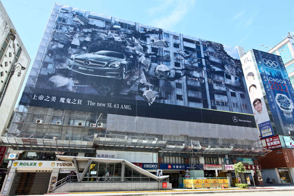The new SL新車發表會最後,Mercedes-Benz首次揭露了一段令眾人驚奇不已的紀錄影片,一棟位於台北東區最熱鬧地段Sogo百貨忠孝館正對面的四連棟舊大樓外牆,發表會前日深夜開始連夜施工,掛上了東區街頭首見最大型的戶外裸視3D廣告,一台彷彿衝破大樓而出的The new SL 63 AMG,以超乎想像的狂野與華麗氣勢吸引眾人目光。