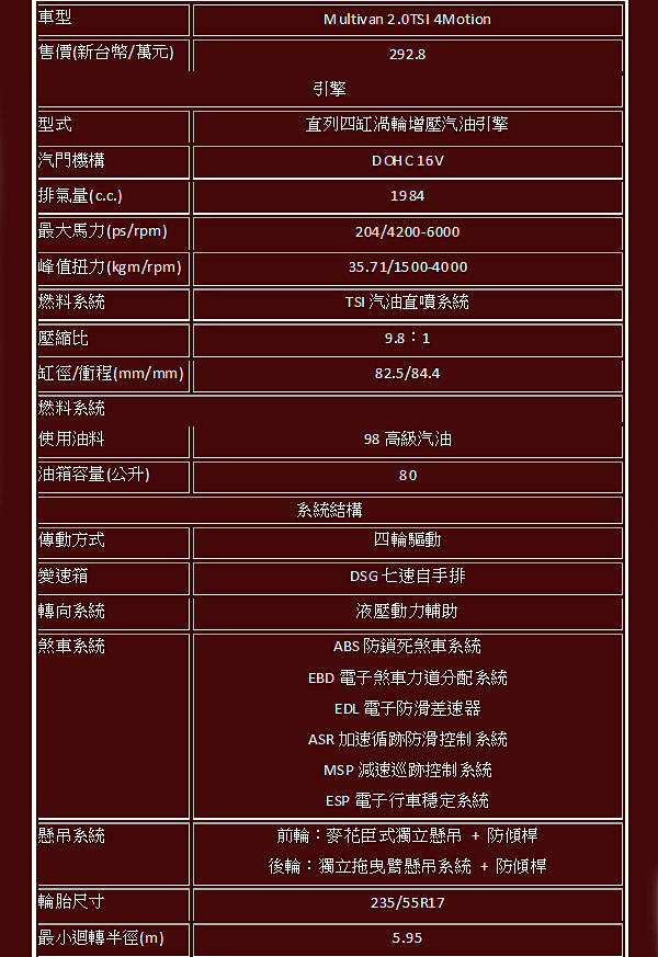 VWCV Multivan 2.0TSI 4Motion五視圖與基本規格表