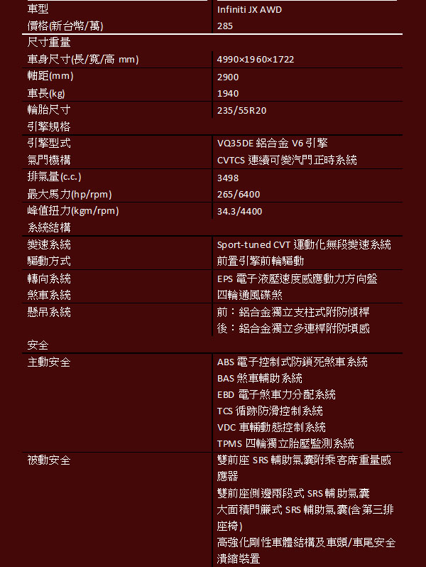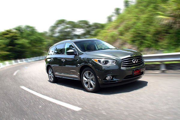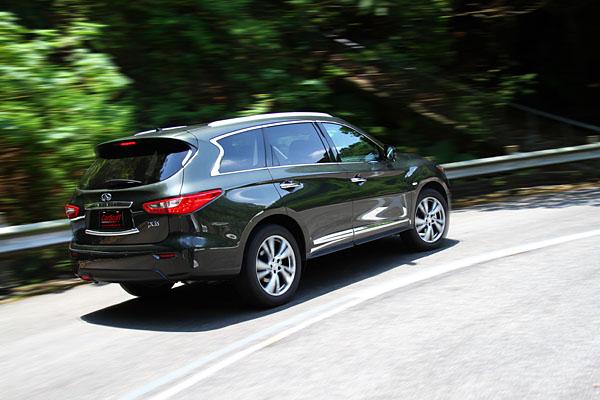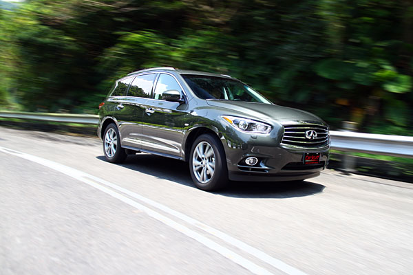 以空間與安全面向切入,JX表現可圈可點,這對於首次跨入此級距的Infiniti而言,是值得稱許的;而對於底盤與動力的設定,對於調校車輛操控一向自有一套的Infiniti而言,JX表現則沒啥大缺點可挑剔,以VQ35DE口碑極佳的V6引擎,雖然受限於JX的龐大身軀,沒有搭載相同動力源的兄弟車款來得熱血沸騰,但在一般模式中的平順與飽滿,或是運動模式中的更為進取,對於此級距的買家而言,相信是可完全對應需求的。