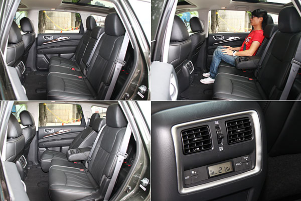 4990mm的車身長度中要盡可能的拉長軸距,是放大座艙空間的不二方法,而從JX極短的前懸,可以發現原廠工程師對其所下的苦心。2900mm軸距長度,利用巧妙安排,以試車組170-178cm兩種身高入座,第二排乘座空間出奇優異,若屏除椅面較短的缺點,乘坐其中是令人感到相當愉悅的。不僅如此,透過第二排座椅具備中央扶手、頭枕上下調整(調整幅度45mm)、前後滑移(調整幅度140mm)與椅背角度調整(10段調整,調整角度20度)等功能搭配,不同成員體型應該皆可到對應的舒適姿勢,且調整機制不難上手,對於一款強調機能的休旅車型,JX一開始的基本馬步蹲得挺紮實。
