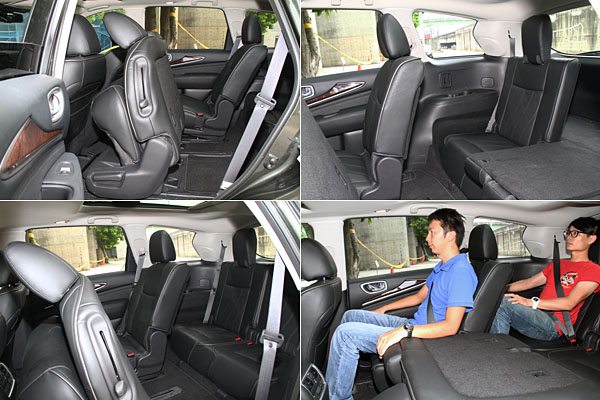 到了許多休旅或MPV車型於空間表現上略為侷促的第三排,首先拉長第二排座椅的前移距離,最大可達60mm的空間便利第三排乘客出入,但受限於車體造型,進出仍需躬身屈膝;但值得鼓勵的是,透過第二排座椅的巧妙設計,縱使第二排座椅安置兒童安全座椅,也同樣可前移第二排座椅讓第三排乘客進出。進入第三排座位後,毫無疑問的空間是較第二排來得縮小許多,以筆者170cm的車高,除了膝部會抵住前排椅背外,受惠內凹車頂與平整式地板等設計,頭部與左右寬度表現尚稱餘裕,若再將第二排座椅往前稍微調整,同時乘坐七名成人,其實也難不倒JX。