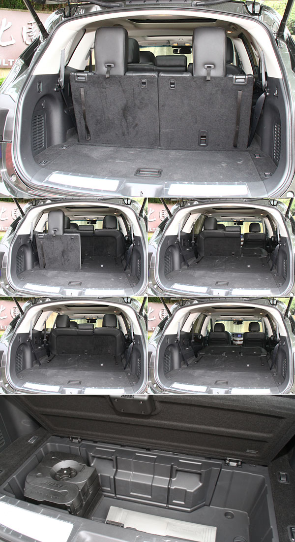 保持七人座、五人座與雙人座時,置物容積可分別達到309公升、1189公升與2053公升,且七人座狀態時後廂下也有一置物盒空間,扣除左側的Bose重低音箱,還有一定空間的置物容積,且隔板採取無段固定設計,更提高實用便利性。